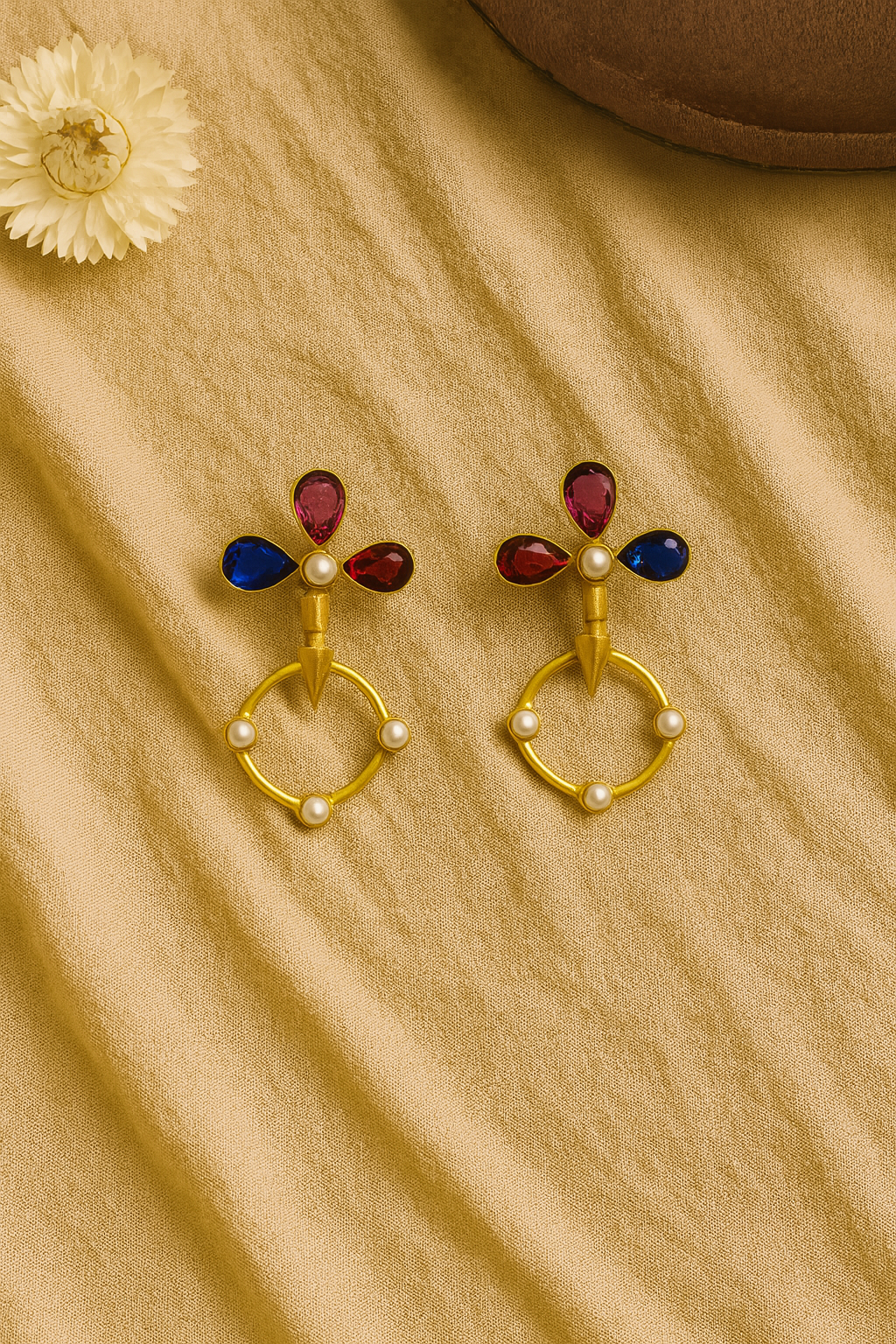 Delicate yet striking, these floral drop earrings feature ruby-toned and cobalt petal motifs accented with pearls and a gold-finished hoop. A graceful blend of tradition and playfulness—perfect for curated festive looks or statement everyday style.