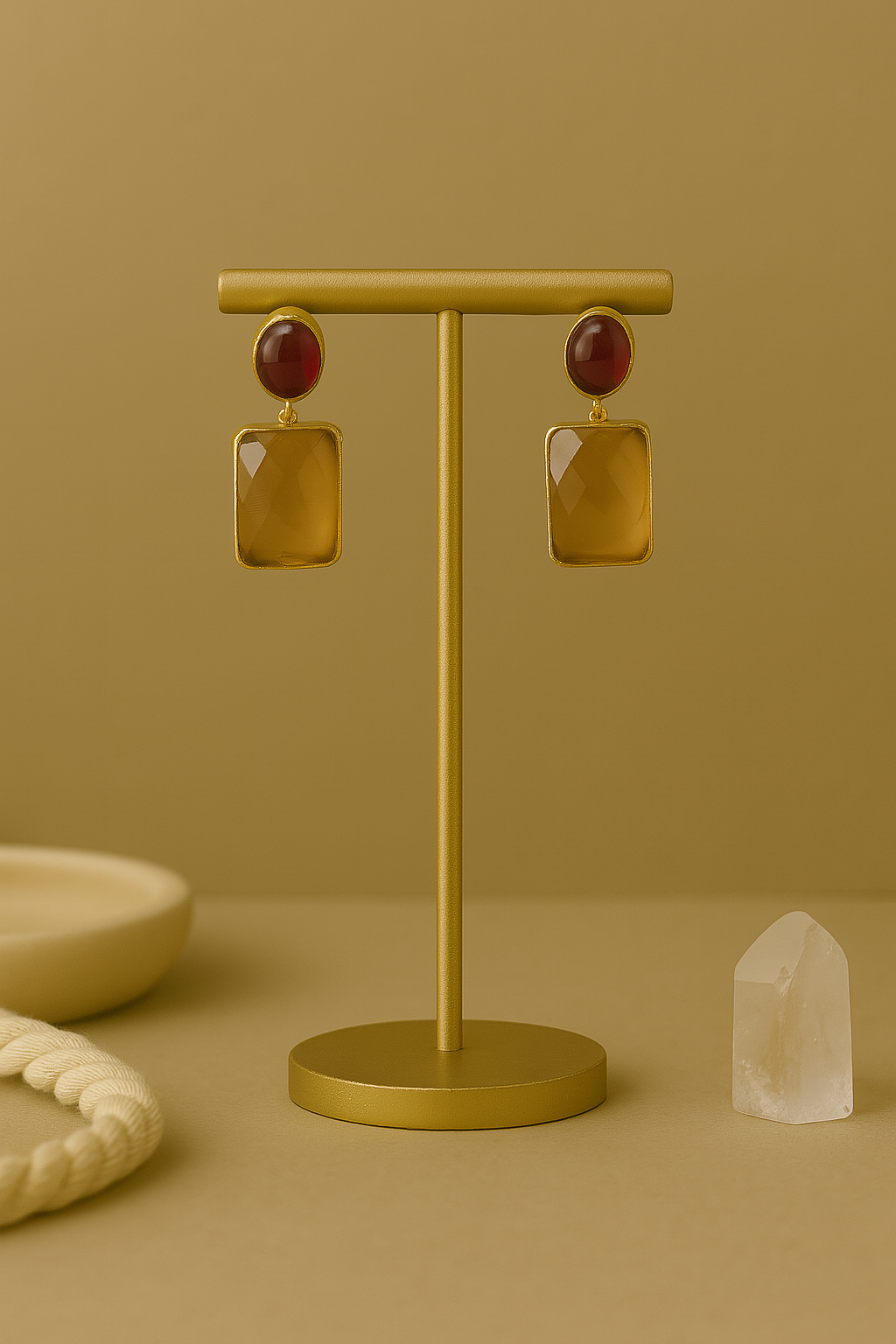 Sleek and sophisticated, these dual-tone natural stone earrings feature a rich red stud paired with a translucent amber drop. A minimalist statement perfect for both everyday elegance and evening charm.