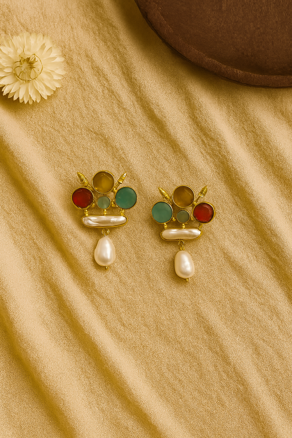 A vibrant medley of red and blue stones accented with gold and finished with delicate pearl drops—these earrings are perfect for festive occasions or adding a pop of color to your ethnic look. Lightweight yet striking, they’re made to be noticed.